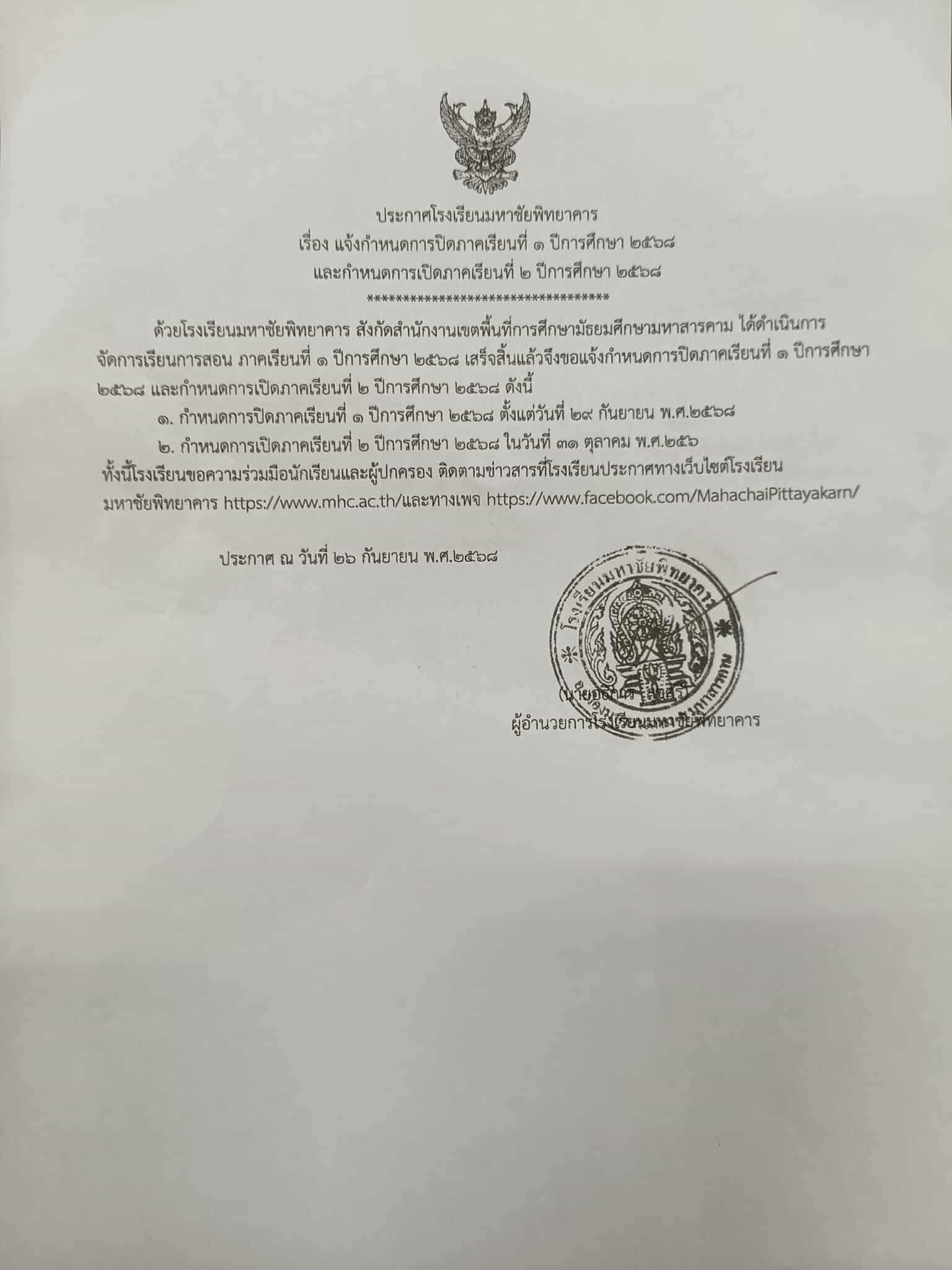 ประกาศรับสมัครนักเรียนที่ต้องการเข้าศึกษาต่อ โรงเรียนมหาชัยพิทยาคาร ประจำปีการศึกษา 2568
